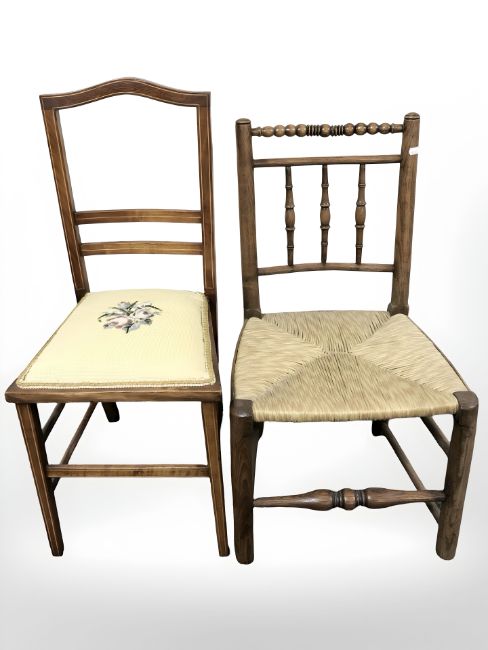 An oak and rattan chair, and another occasional chair.