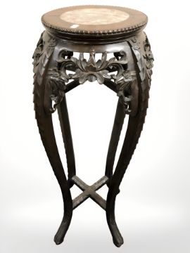 A 19th century Chinese carved hardwood and marble inset jardiniere stand, height 91 cm.