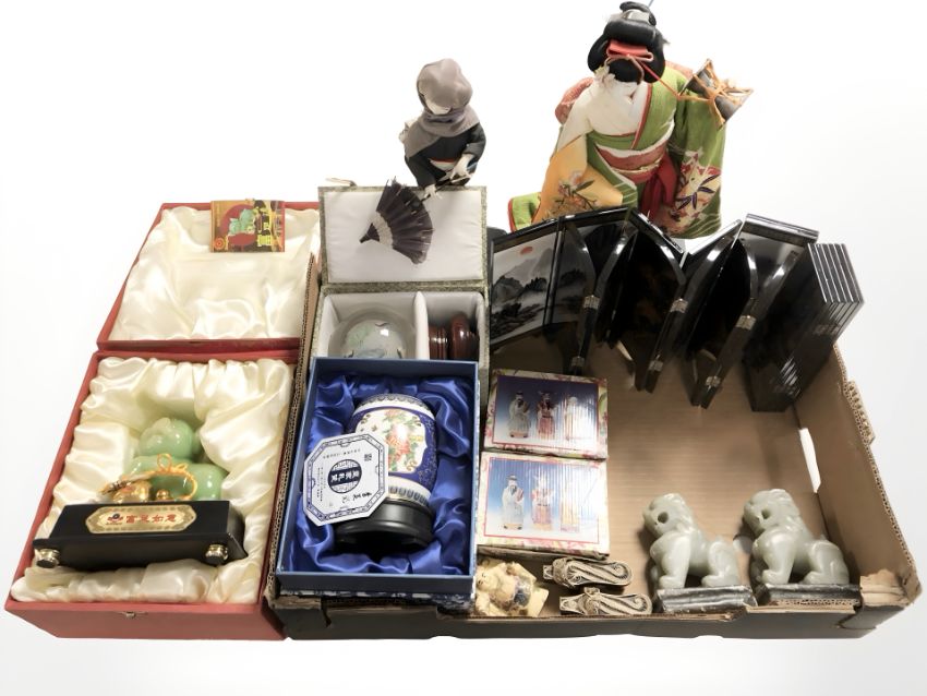 Oriental wares including a pair of carved soapstone foo dogs, miniature lacquer temple screens, figures, porcelain barrel shaped vessel, small pair of filigree slippers, etc. (1 box)