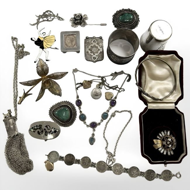 An interesting group of jewellery and collectables including silver items, stamp case, cabachon necklace, lady's chain purse with dog finial, 9ct gold heart locket (1.1g), coin bracelet, Mexian brooch etc.
