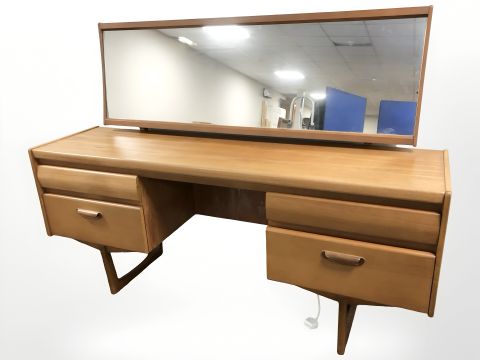 A Chapman's Siesta teak twin pedestal mirror back dressing table, 156 cm W x 42 cm D x 116 cm H.