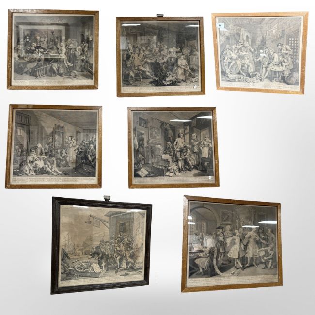 Seven monochrome prints after the originals by Hogarth in 1735, each approximately 40 cm x 35 cm.