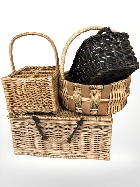 A wicker picnic hamper and three baskets, largest 52 cm wide.