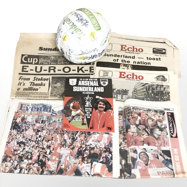 A group of newspapers concerning Sunderland AFC, Arsenal v Sunderland April 7th 1973 F.A Cup Semi-Final match day programme, a signed football etc (1 box)