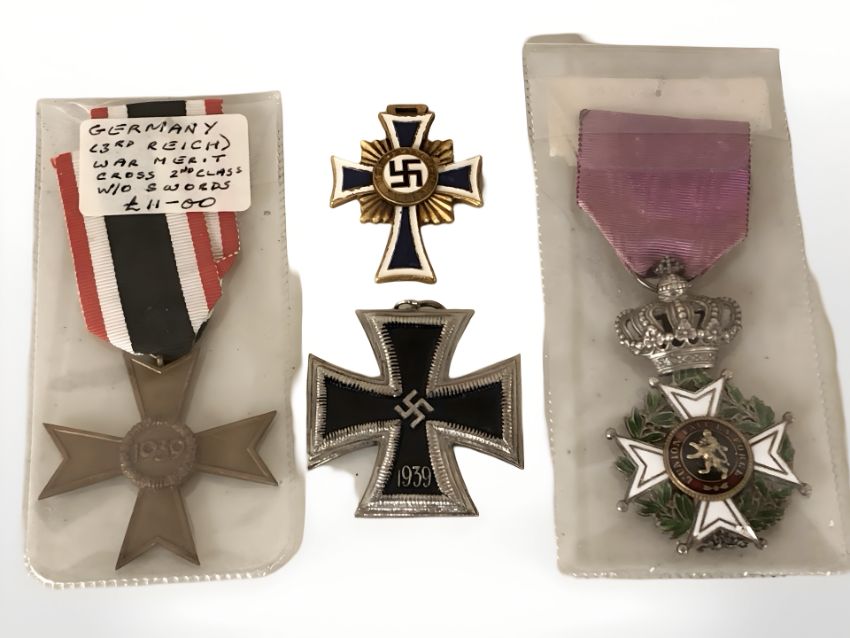 A group of medals of medals comprising a Belgian Order of Leopold, a German War Merit Cross 2nd class, a Cross of Honour of the German Mother and an Iron Cross (copy).