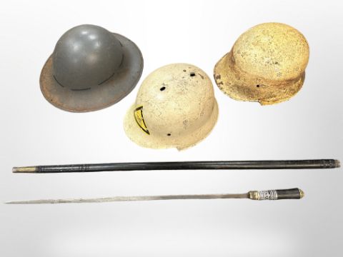 A 1941 dated Zuckermann helmet complete with liner and chin strap and two Third Reich Fire Police helmet shells one with post war re-issue emblem, together with an Indian bone and ebony swordstick. (4)