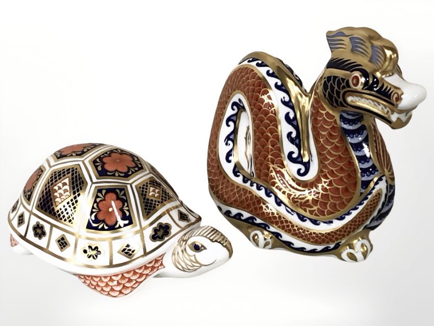Royal Crown Derby dragon and tortoise paperweights, tallest 11 cm. (no stoppers, 2nd quality)