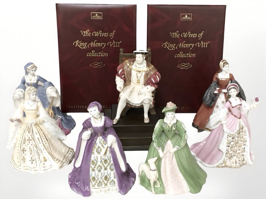 A Wedgwood set of The Wives of King Henry VIII, comprising Henry No. 1841 of 4500, with plinth, Catherine of Aragon No. 1287 of 7500, Anne Boleyn No. 1881 of 7500, Jane Seymour No. 1583 of 7500, Anne of Cleves No. 709 of 7500, Catherine Howard No. 1374 of 7500 and Catherine Parr No. 1323 of 7500, with accompanying booklets containing certificates.