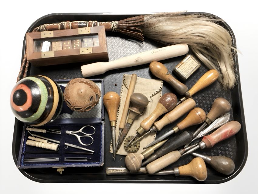 A group of dominoes, pastry cutter and other utensils, African fly swish, etc.