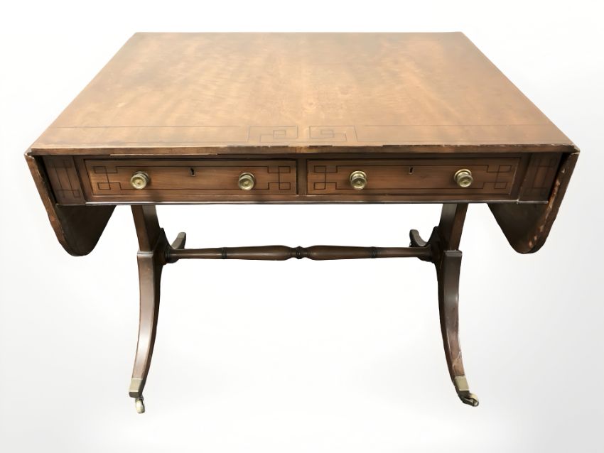 A Regency mahogany and ebony strung drop leaf sofa table, 89 cm x 65 cm x 71 cm (un-extended)