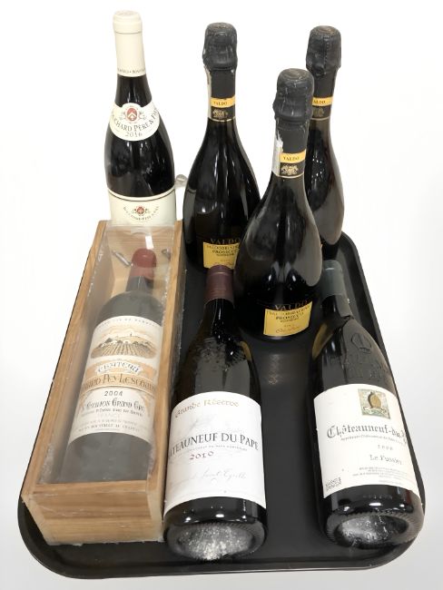 Seven various bottles of alcohol including Chateauneuf du pap, Valdo prosecco.