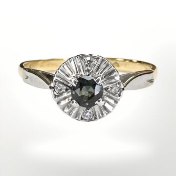 An 18ct yellow gold ring illusion set with diamonds and a single blue / green sapphire, size O. CONDITION REPORT: 2.7g.