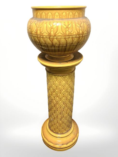 A Victorian glazed earthenware jardiniere on stand, height 116 cm. (as found)