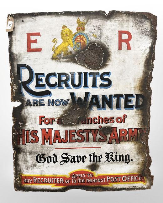 An enamelled metal recruitment sign 'Recruits are now wanted for all branches of His Majesty's Army', 66 cm x 81 cm.