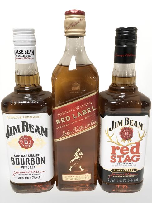 A bottle Johnnie Walker Red Label scotch whisky, 70 cl, a bottle of Jim Beam Kentucky straight bourbon whisky, 70 cl, and Jim Beam Red Stag black cherry liqueur, 70 cl.