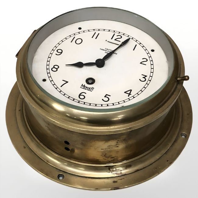 A Mercer brass circular ship's style timepiece, diameter 23 cm.