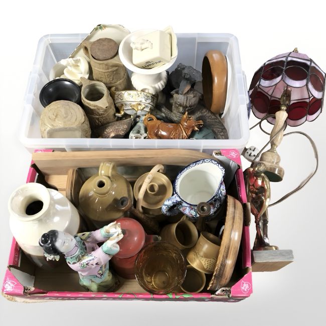 Assorted pottery jugs, vases, figures, pair of oak candlesticks, Tiffany style table lamp, etc. (2 boxes)