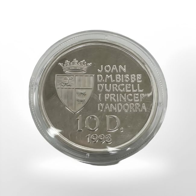 An Andorra 1993 10 Dinar 0.925 silver coin, 31.6g
