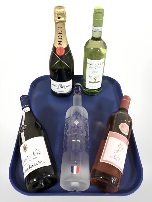 Five various bottles of alcohol : Moet & Chandon champagne, Pinot Grigio, Pinot Noir, Saint Germont vodka and Bearfoot Pink Moscato
