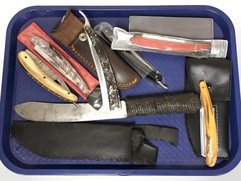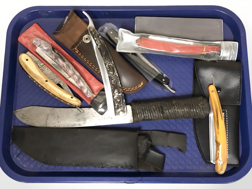 A group of folding cutthroat razors, a further knife in sheath with rope bound grip and a sharpening stone.