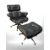After Charles & Ray Eames : A contemporary model 670 swivel lounge armchair and 671 footstool, with curved and laminated frames, upholstered in black buttoned and piped leather, on enamelled metal supports and chrome feet, chair 82 cm wide.