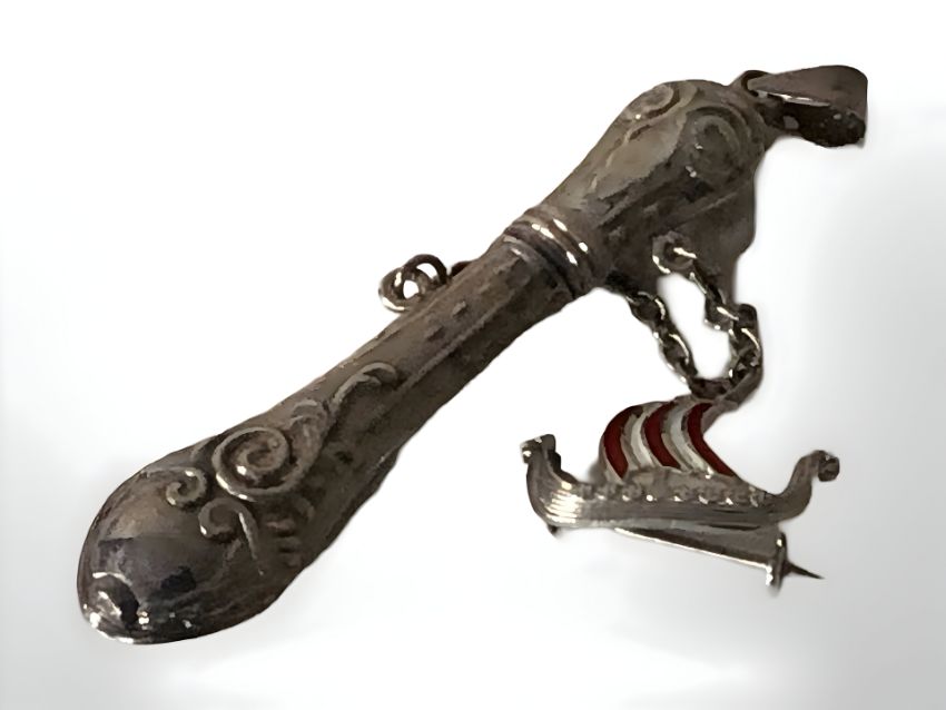 An embossed silver scent bottle pendant, length 6 cm, and a Scandinavian enameled silver long ship brooch.