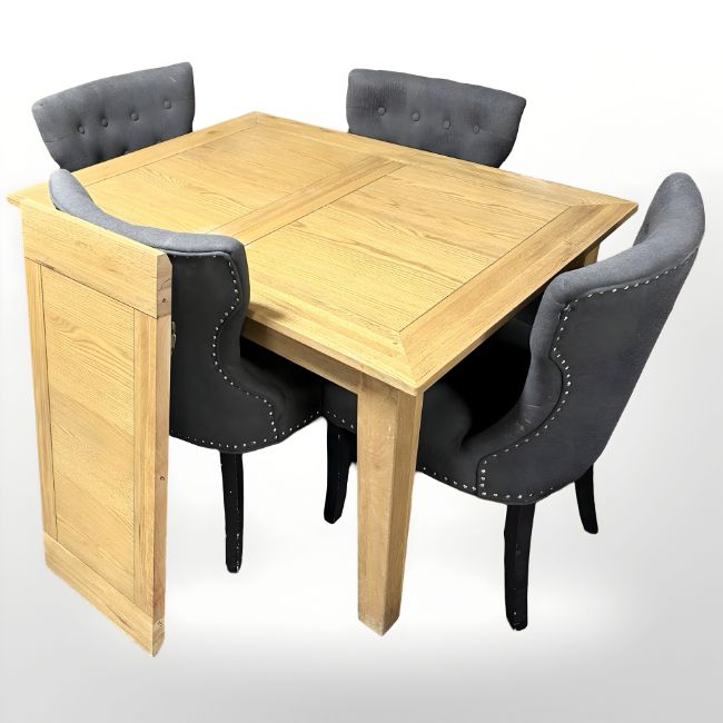 A contemporary oak extending rectangular dining table, 120 cm x 95 cm x 76 cm (extended) and four dining chairs in buttoned charcoal fabric