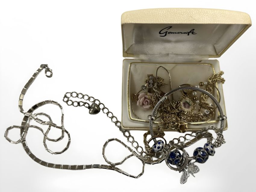 A group of costume jewellery items, gold plated chains, charm bracelet, long chain necklace