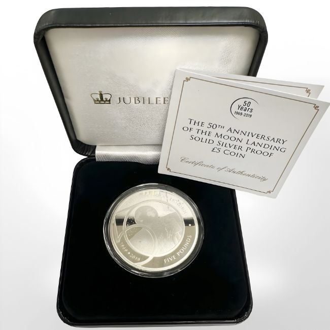 A Queen Elizabeth II 2019 50th Anniversary of the moon landing 0.925 silver proof five pound coin, 28.28g, cased.