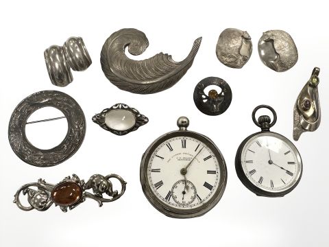A group of silver and white metal jewellery, clip earrings, Scottish brooch, Sterling silver 'Shine' brooch, Silver Express lever pocket watch, silver fob watch etc