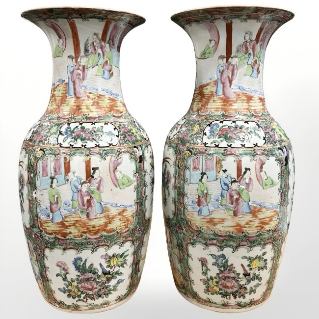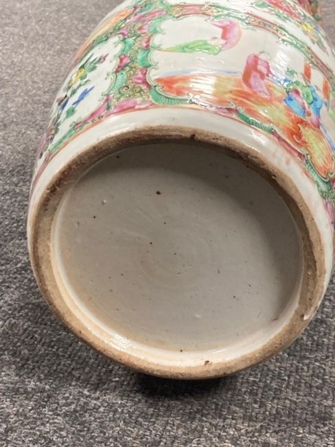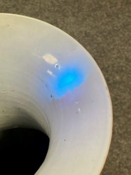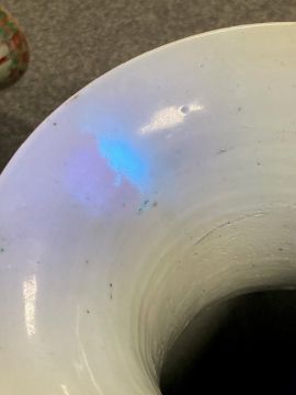 Please refer to additional images. Both vases have discolouration to the rim in keeping with being restored and are reactive under UV light to the colour change in the glaze. Both vases are not cracked or showing further signs of damage or repair. They both dont have any audible change in tone when tapped along the rim suggesting no chips or cracks.