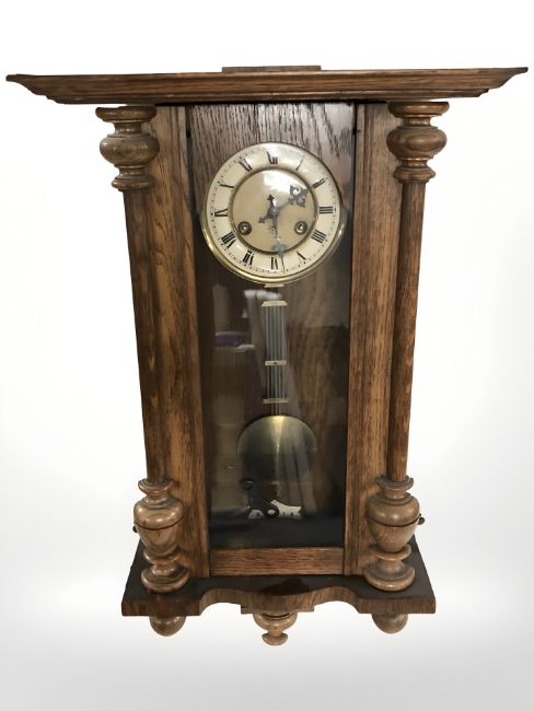 A Junghans oak wall clock, with pendulum and key, length 71 cm.