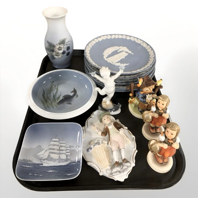 A group of Wedgwood jasperware plates, Royal Copenhagen shallow dishes and vase, Goebel figures, etc.