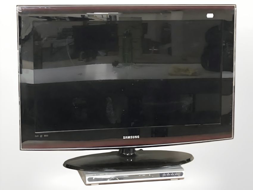 A Samsung 32" LCD TV, with lead, remote, and an Alba DVD player.