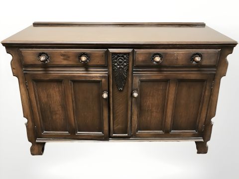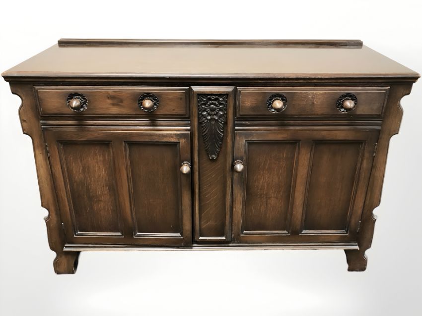 An early 20th century oak sideboard, 138 cm W x 52 cm D x 91 cm H.