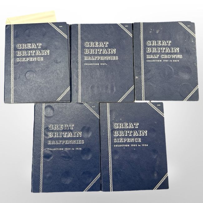 Five Whitman folders of coins, one complete, the others partially-filled, some silver sixpences amongst them
