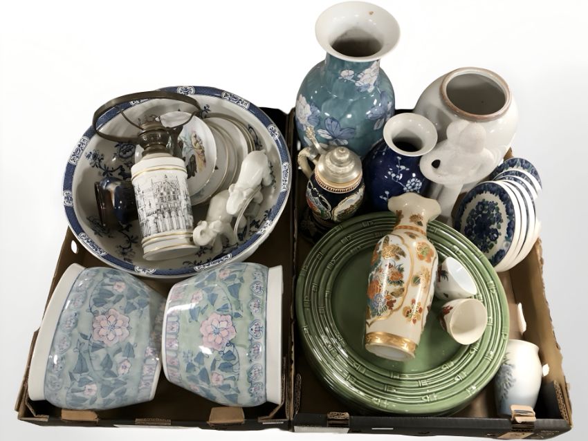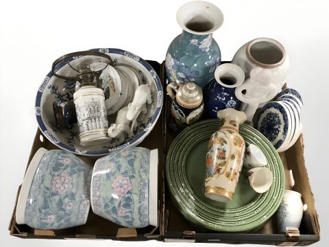 Assorted oriental vases, ceramic planters, oil lamp base, etc. (2 boxes)