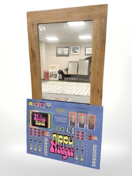A contemporary oak mirror, 60 cm x 120 cm, together with a glass fruit machine panel 'Nippy Nudger'.
