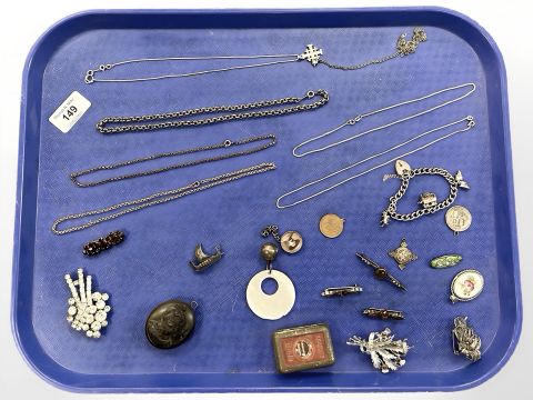 A group of antique and later jewellery items to include silver charm bracelet, three silver necklaces, belcher chain, brooches, Scottish agate brooches, etc.