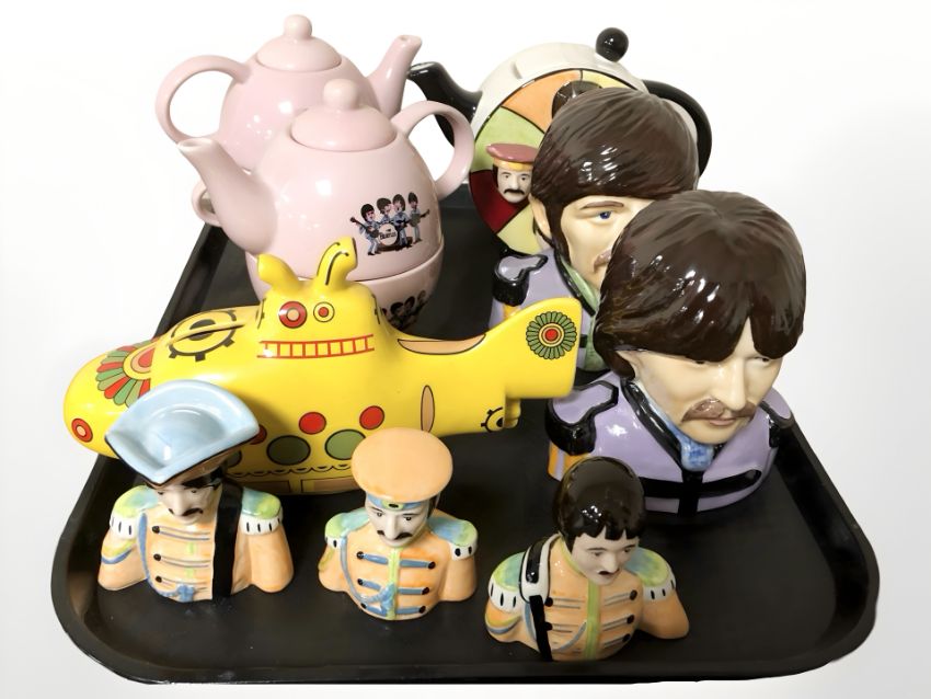 The Beatles - A group of ceramics including A Lorna Bailey tea pot, two busts marked 'Artists original proof for Peggy Davies by Victoria Bourne', three further busts signed Lorna Bailey, a Yellow Submarine money box and two Price & Kensington tea pots with matching mugs.