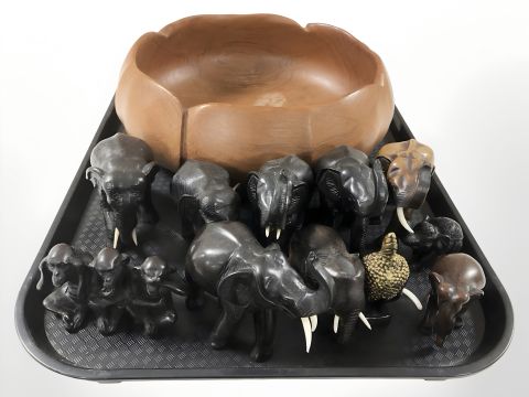 A wooden fruit bowl. a group of resin elephant ornaments and Thai bust of Buddha.