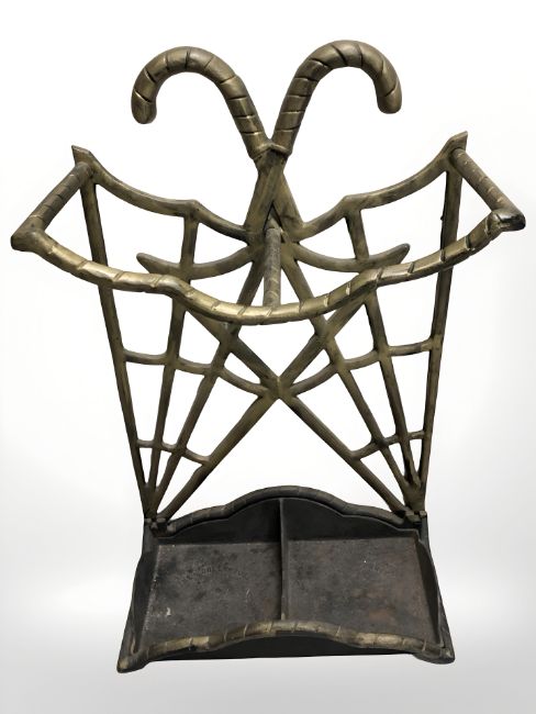 A brass umbrella stand with drip tray stamped 'The Greenhouse, Paris, France', height 66 cm.