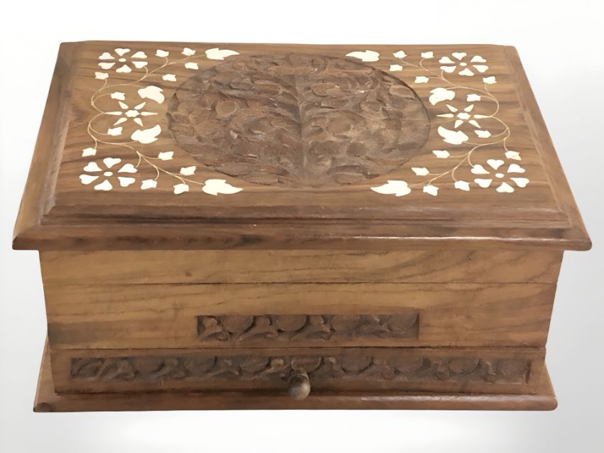 An Anglo Indian bone inlaid jewellery box containing a small quantity of costume jewellery, width 28 cm.
