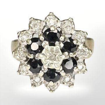 A 9ct yellow gold cluster ring set with diamonds and sapphires, size N.