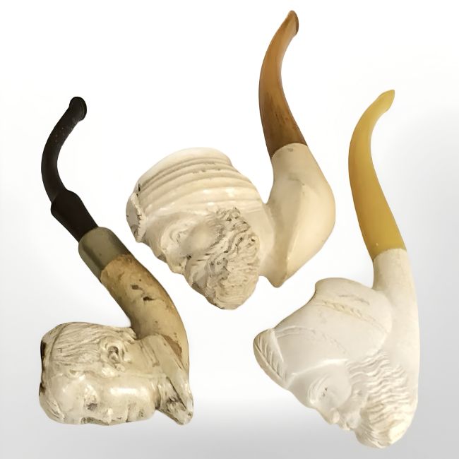 Three Meerschaum pipes with figural bowls, two in the form of Turks wearing turbans.