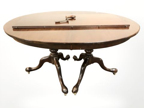A mahogany oval extending dining table with leaf and five various chairs