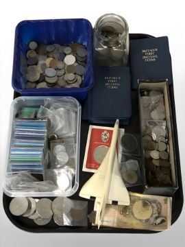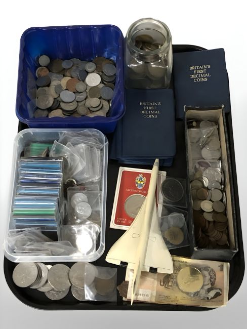 Assorted coins including crowns, decimal coin sets, bank notes, pre-decimal, a model of Concorde, etc.