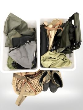 A pair of hiking boots, size 10, wellington boots, ruck sacks etc (2 boxes)