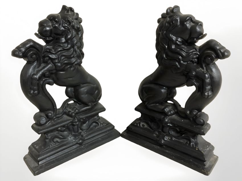 A pair of reproduction painted cast iron lion doorstops, height 36 cm.