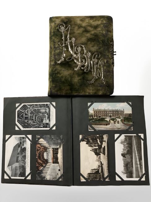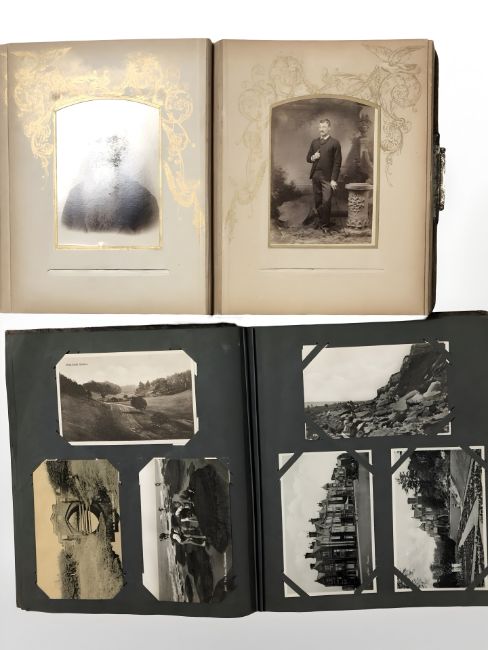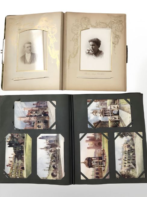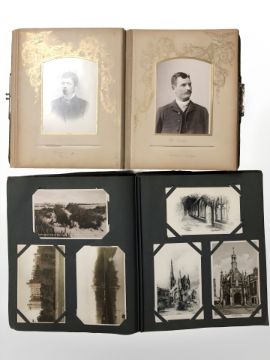 Two albums of antiquarian monochrome and colour postcards, portrait photographs, etc.